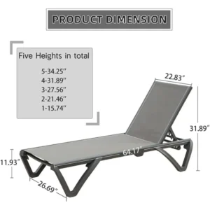 SPECIFICATIONS Brand: SucceBuy Brand Name: SucceBuy Folded Dimensions: 43.7 x 23.43 x 4.13 in/1110 x 595 x 105 mm General Use: Outdoor Furniture High-concern Chemical: None Installation Method: Assembly Load Capacity: 400 lbs/181.44 kg Main Material: Aluminum Alloy + Sterling Fabric Material: Fabric Net Weight: 17.64 lbs/8 kg Origin: Mainland China Specific Use: Sun…