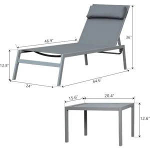 SPECIFICATIONS Appearance: Modern Style Brand Name: AuAg Folded: No General Use: Outdoor Furniture High-concern Chemical: None Installation Method: Assembly Material: Metal Metal Type: aluminum Model Number: Sun Lounger Recliner Set Origin: Mainland China Size: 153 x 64 x 83.5cm Specific Use: Sun Lounger With Handrails: Yes