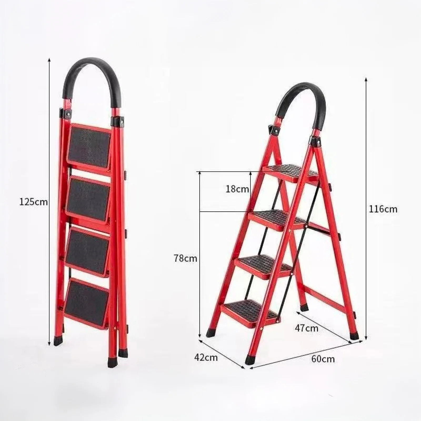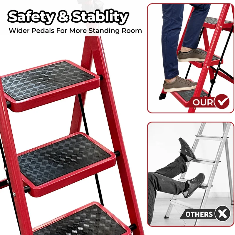 This folding step ladder prioritizes safety, durability, and convenience for home/office use.