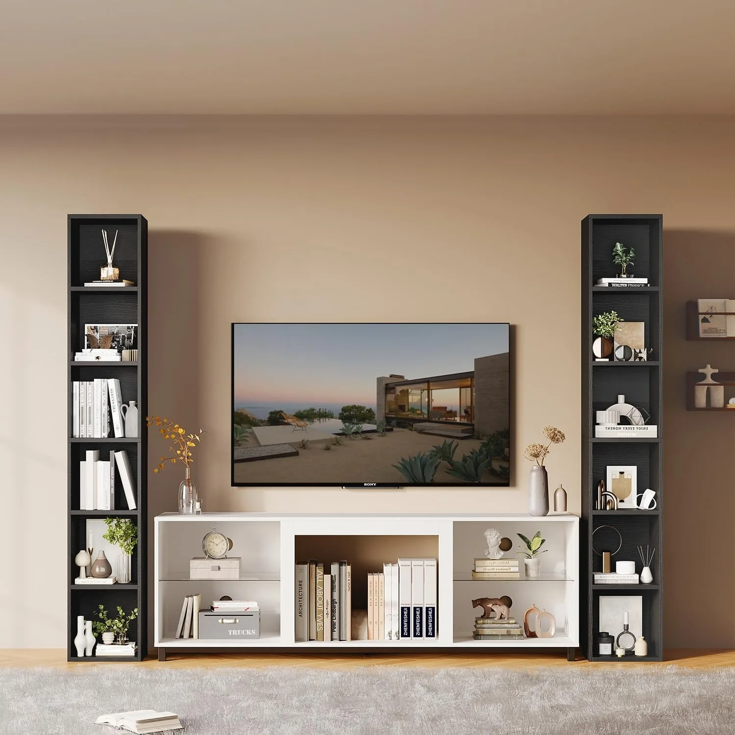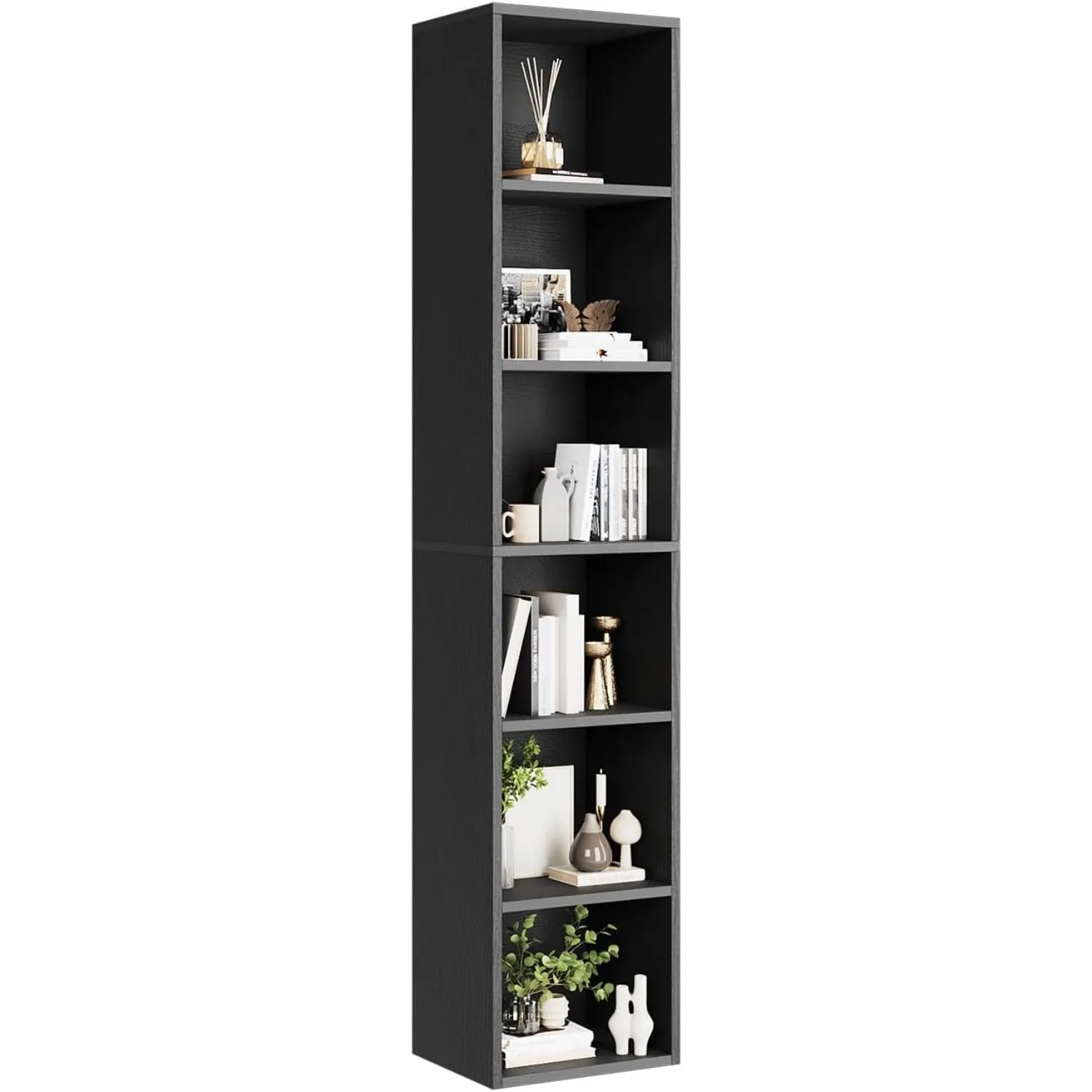 narrow bookshelf that is 71.5 inches high, a 6-story cube display rack, and a single black 6-story CD storage cabinet for the home office