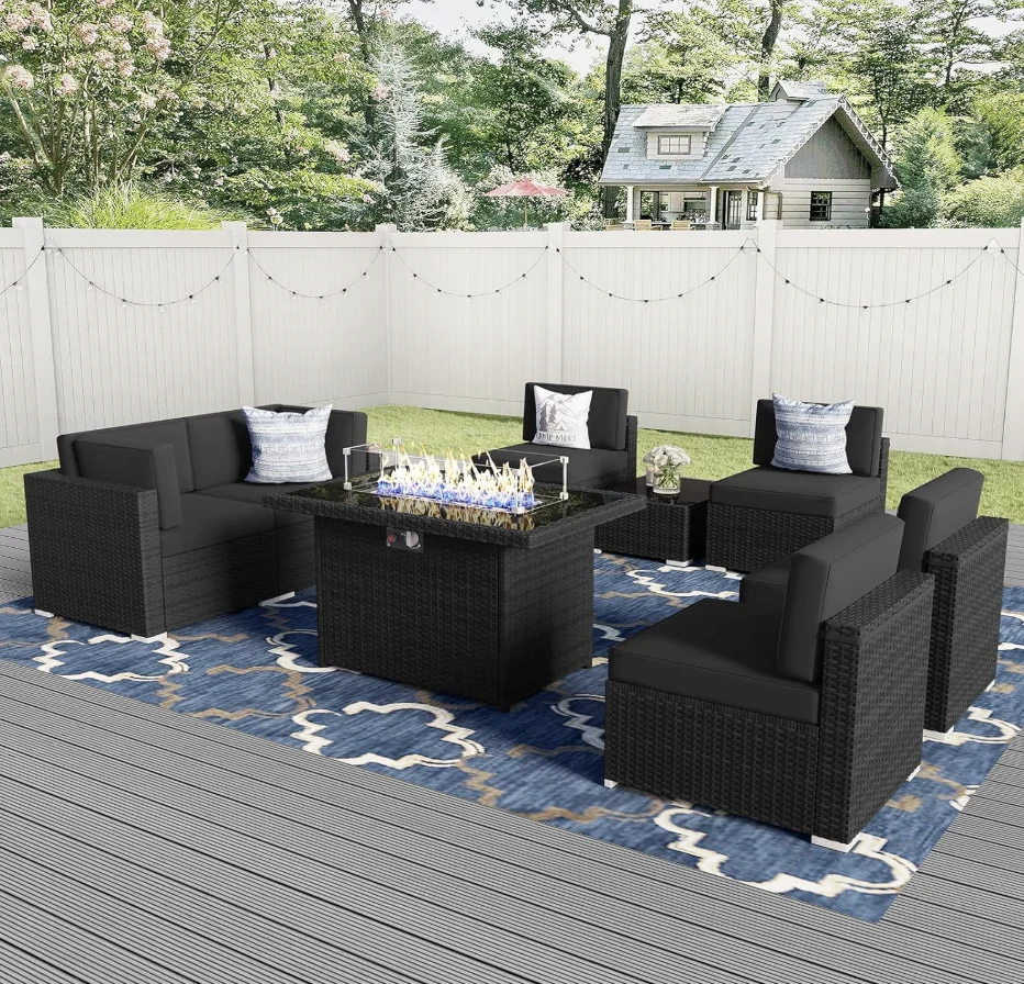 Outdoor Sectional Wicker Conversation Sofa Sets with Coffee Table, 44″ Propane Gas Fire Pit Table, and 8 Piece Patio Furniture Set